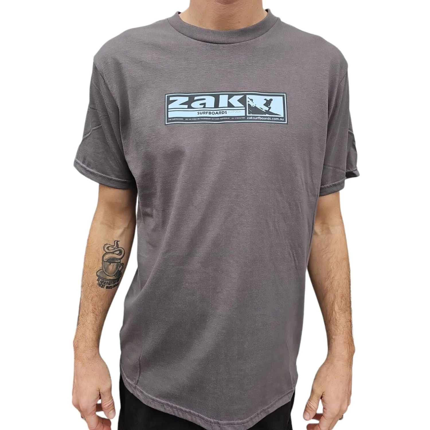 Zak T-Shirt OG Sticker Logo Charcoal (Blue Sticker) is our new logo which has been our original sticker design since the early days. Regular fit, crew neck T-shirt 180gsm 100% cotton pre-shrunk.